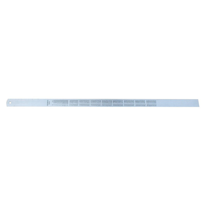 This stainless steel rule is made of hardened steel and has a hanging hole. One side of the ruler is graduated up to 600 mm, while the other side features a table with an inch-to-millimeter conversion. The width of the rule is 25 mm, the total length is 630 mm, and the thickness is 1 mm.